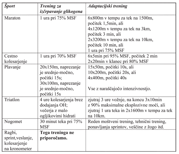 Okno 4: Kako naj treniramo v stanju, ko so zaloge glikogena v mišicah delno izčrpaneDa bi želi prednosti treniranja z nizko koncentracijo glikogena v mišicah moramo le-to zmanjšati za 30–35%. To z lahkoto dosežemo, če izbrano dejavnost (tek, kolesarjenje itd.) z intenzivnostjo, ki jo določa 70% maksimalne srčne frekvence, izvajamo 30–60 minut in ne jemljemo nobenih ogljikohidratnih dodatkov.